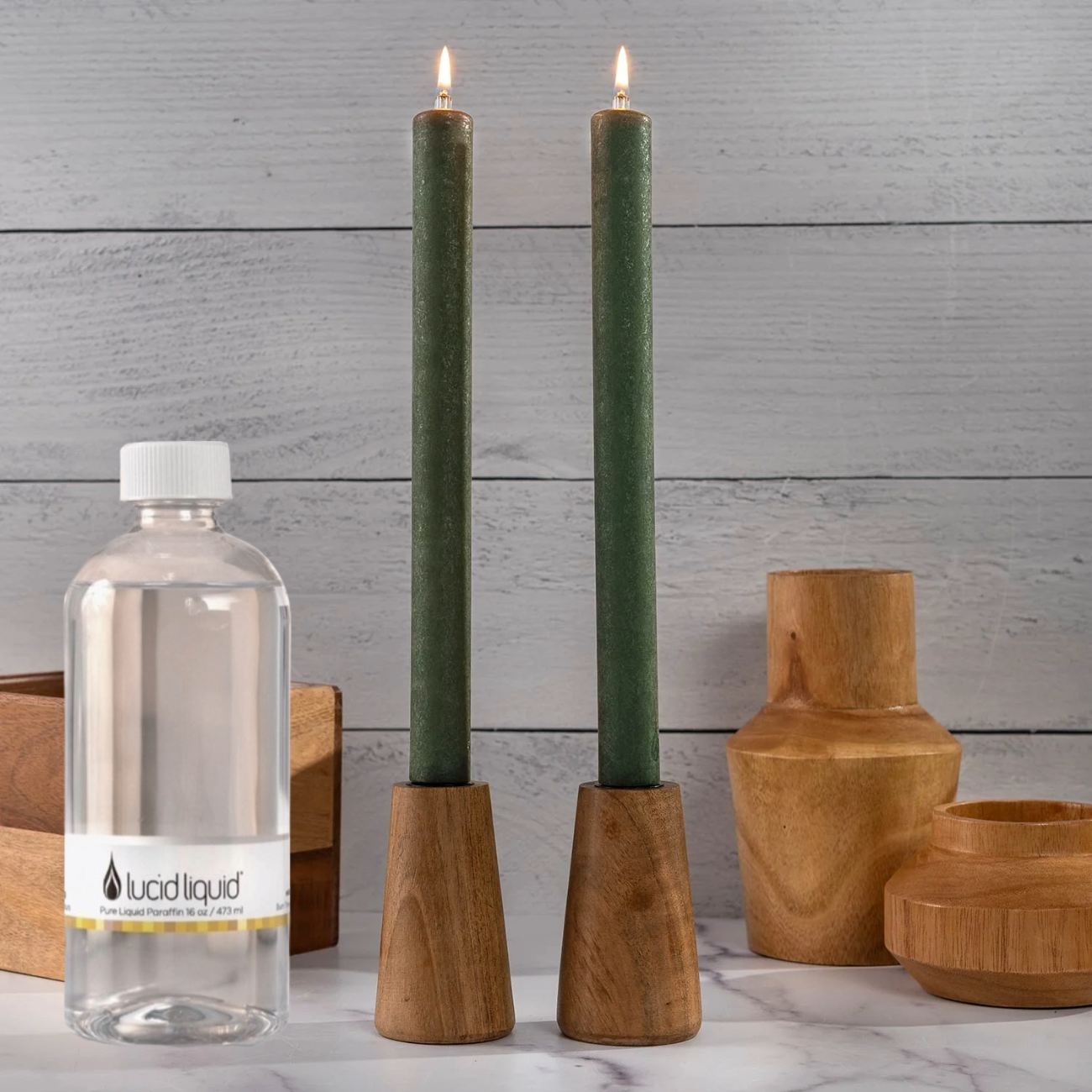 This Lucid Gift Set includes two 11" Lucid Dinner Candles (you select the color) and one 16 oz bottle of Lucid Liquid.